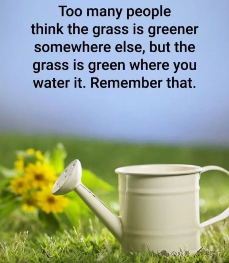 Too many people think that the grass is greener somewhere else but the grass is green where you water it. Remember that. 世人总以为别处的草色更绿,殊不知,何处用心浇灌,何处便有青青芳草。请铭记于心!早上好!